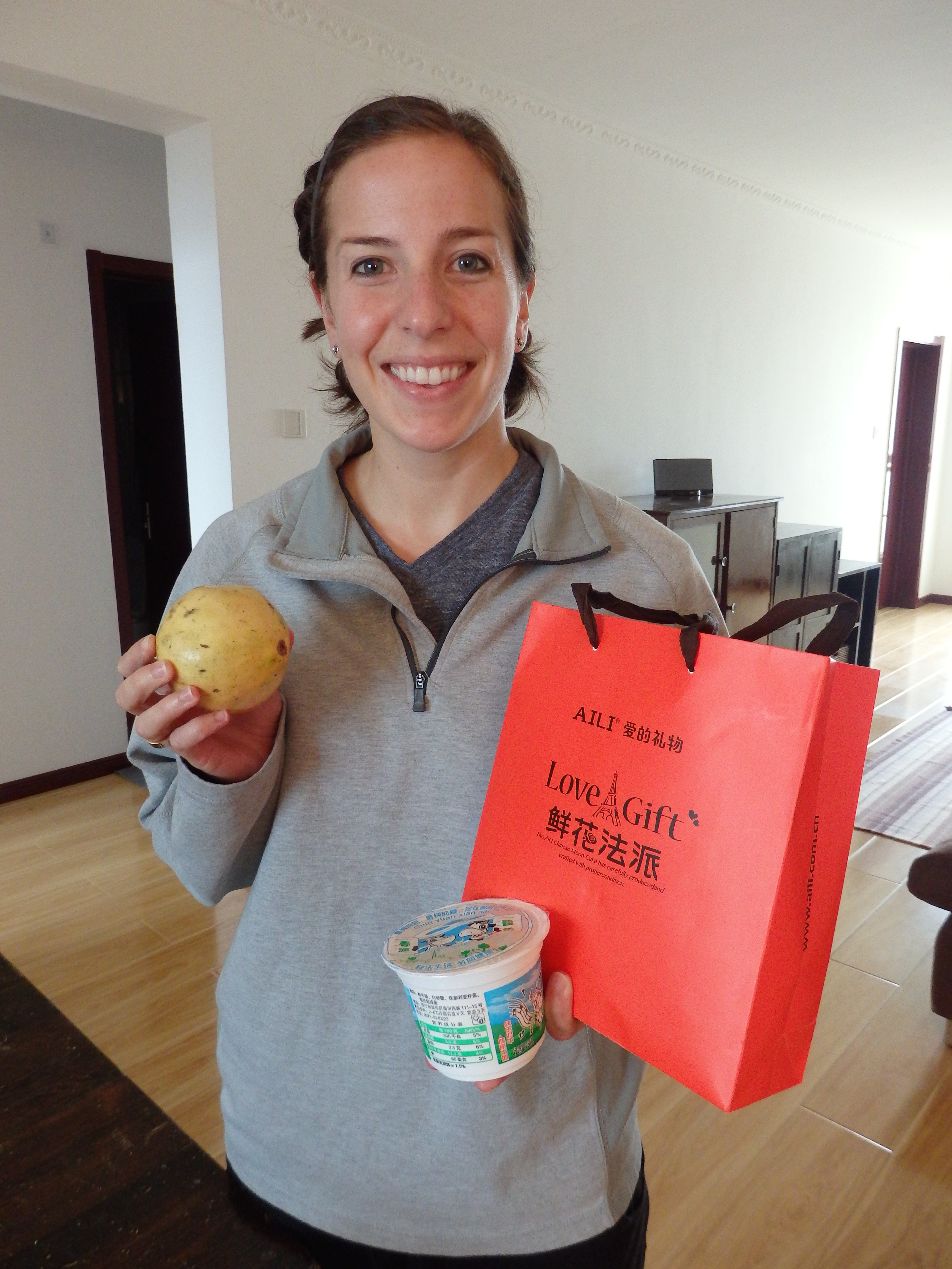 September 8th was one of China’s biggest holidays: Mid-Autumn Festival. Supposedly it dates back to the 14th century BC and is always held on the 15th day of the eighth month (according to the lunar calendar). The traditional custom is for the Chinese people to gather as a family and enjoy fruits and moon cakes while admiring the full moon. Since people here consider the full moon to be a symbol of reunion and satisfaction, the moon cakes are sometimes called “Reunion Cake.” **Moon cakes are round and come in many different varieties with different fillings, and differ from region to region (think huge fig newton). Kristen and I also found out (after each consuming 4 in one sitting) that they are over 1,000 calories a piece. After knowing that stat, I’m surprised the U.S. hasn’t taken to this dessert 🙂