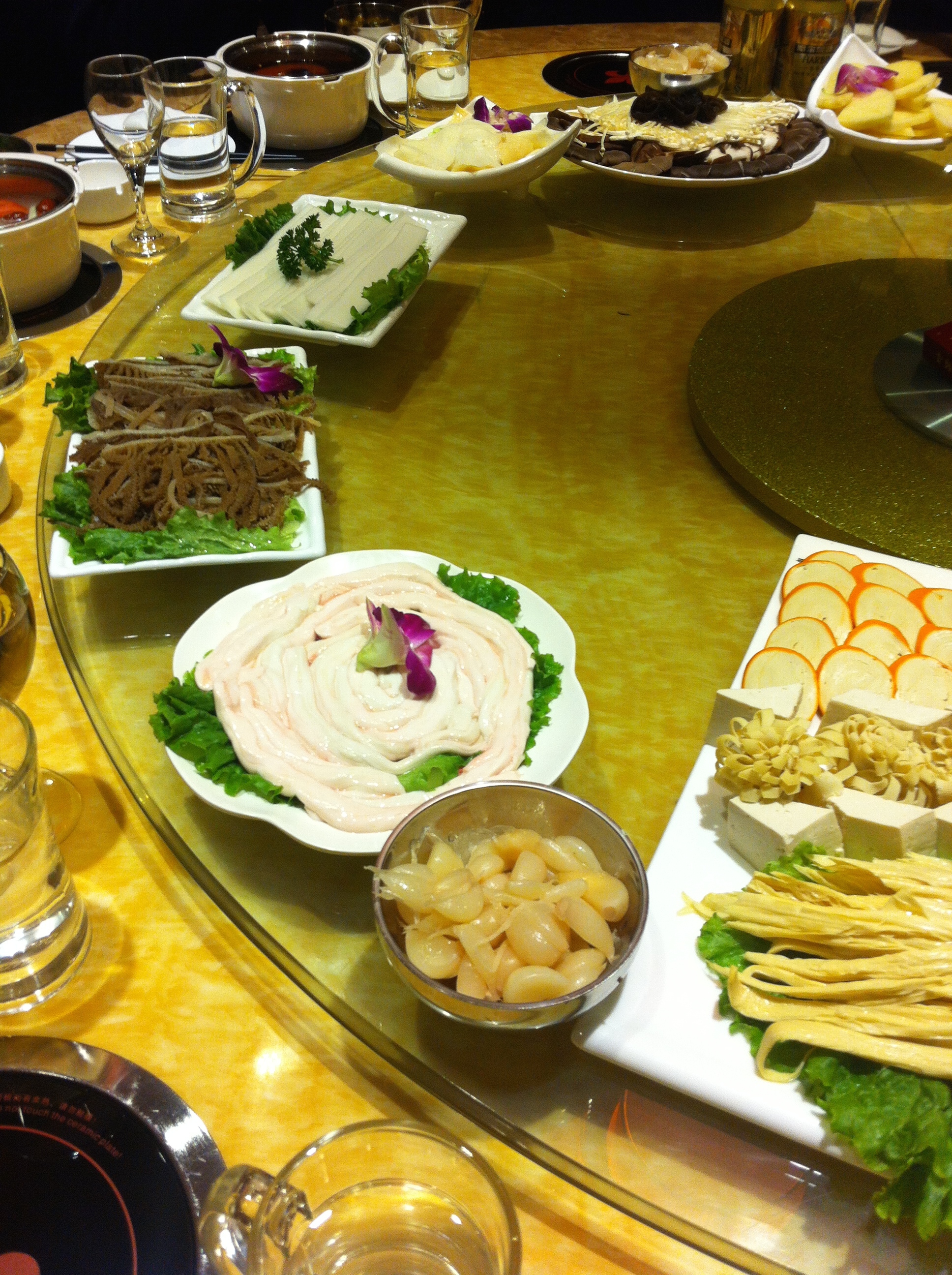 Then on to dinner… from top right: potatoes, mushrooms, cow throat, potato noodles, cow stomach, bone marrow, sweet garlic, tofu plate. Mmm 🙂